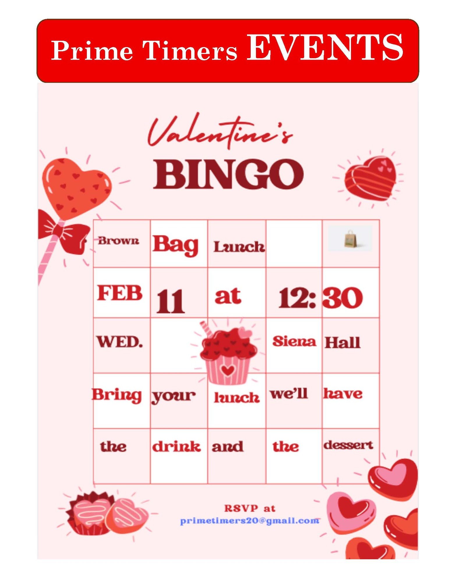 Contact us at [email protected], or pick up the Prime Timers EVENTS in the narthex.